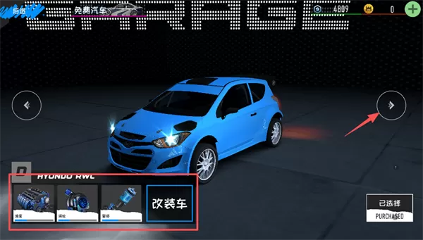 7、于屏幕左下方,能够自行对车辆性能进行改装,或者自定义车辆外观,此外,点击屏幕左右两边的“箭头”,还可实现车辆的更换。