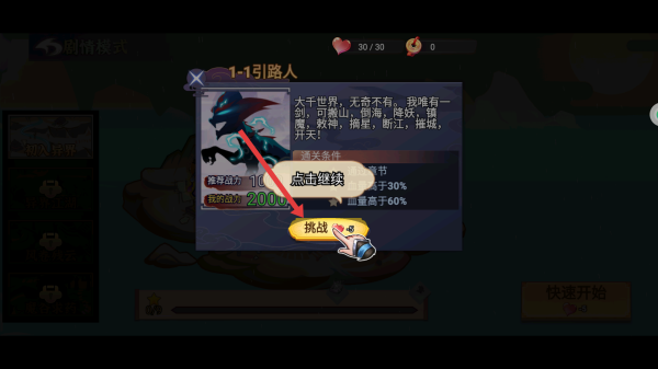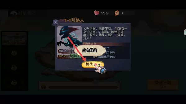 1. 开启剧情模式,挑选第一关“引路人”关卡,点击“挑战”进入关卡战斗,做好与敌人一决高下的准备。