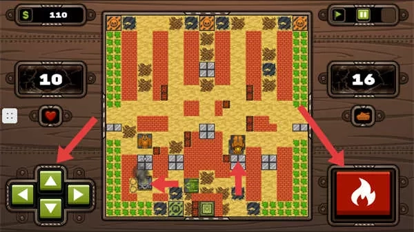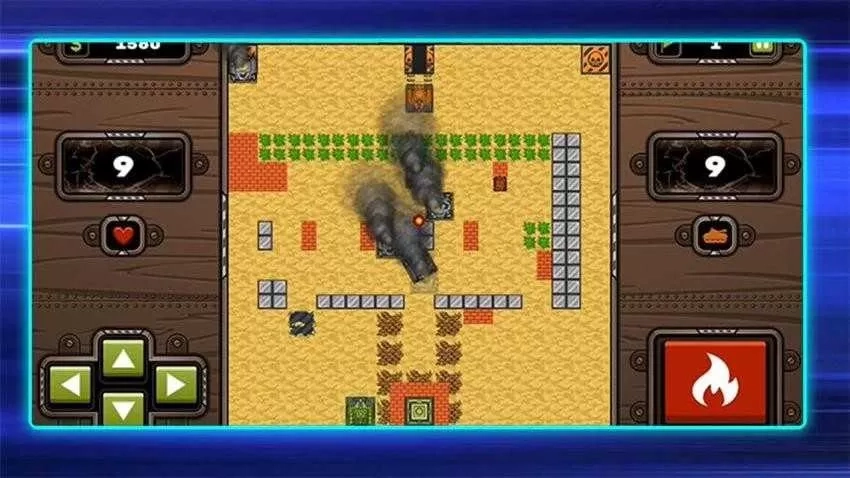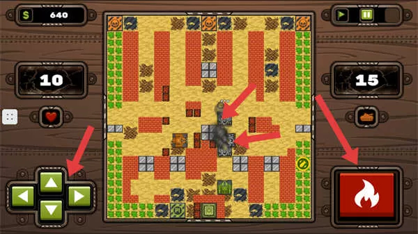 3、通过方向键来控制坦克移动,点击火焰按钮即可发射炮弹,以此攻击敌人或者破坏障碍物,进而推动游戏进程。