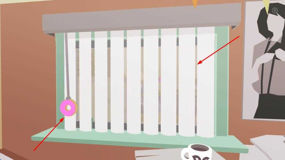 3、室内场景里,找到粉色甜甜圈互动元素,操作它触发与百叶窗等场景互动,解锁新内容。