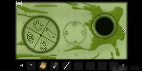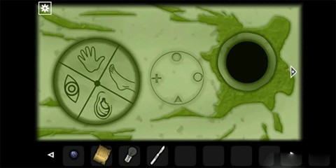 通过电梯来到一层,先往左走进入第一个房间,拿走左下角的「蓝色弹珠」。点击画像,观察画像上的符号。