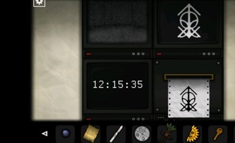 观察显示屏,拿走右下角的「纸条」并记住时间「12:15:35」,再拿走桌子下面的「红色弹珠」。
