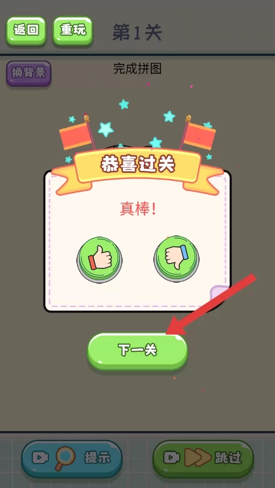 4、当【恭喜过关】界面出现后,点击【下一关】按钮,即可解锁并挑战后续的拼图关卡。