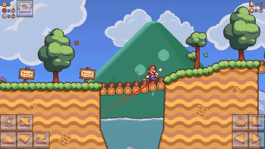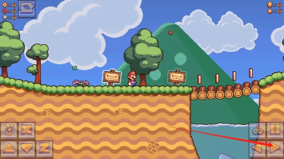 1、点击右侧的前进按键,可控制角色向右移动,探索地图,通过木桥等地形,推进游戏进程。