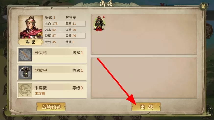 2、能查看武将如孙坚的属性,包括生命、攻击等,确认武将装备后,点击出战,让武将参与到战斗中,开启战场征程。
