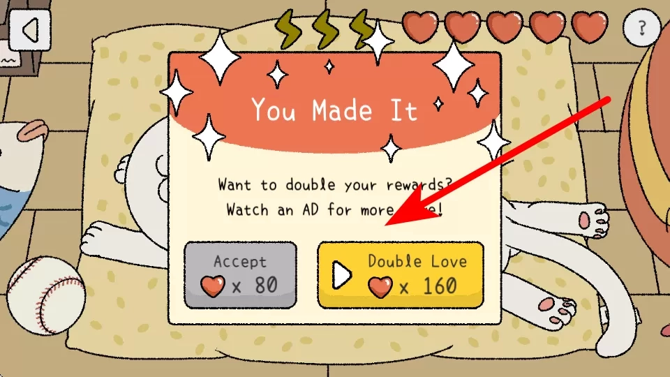 2、完成目标后,可选择观看广告让奖励翻倍,不看广告就直接领取80个爱心,观看的话能获得160个爱心。