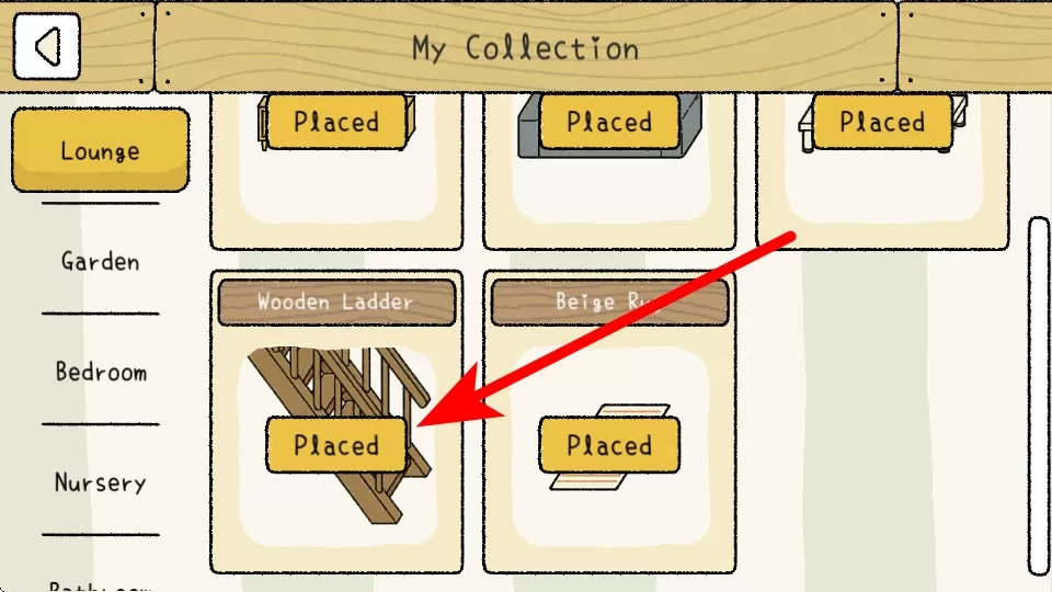 3、在“我的收藏”界面里,能看到不同场景的物品,比如木梯这类物品上显示,代表已经成功放置。