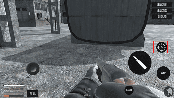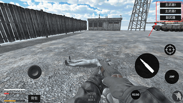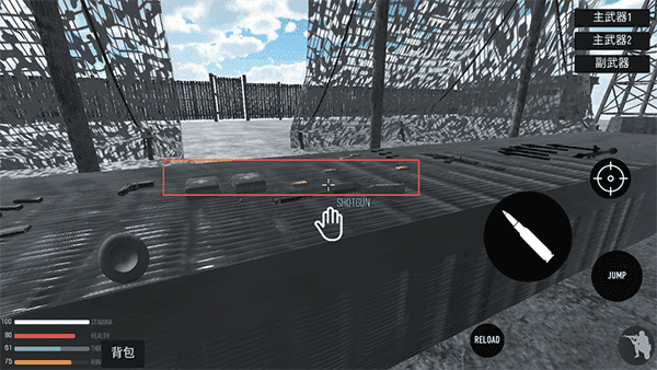 1进入游戏后,在帐篷里的桌子上,能看到摆放着许多枪支与子弹,当靠近出现手掌图标时,点击就能拾取。