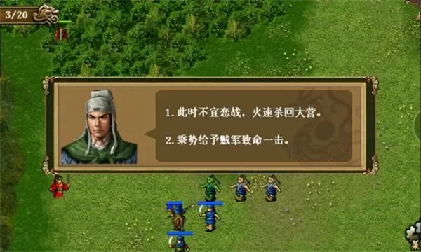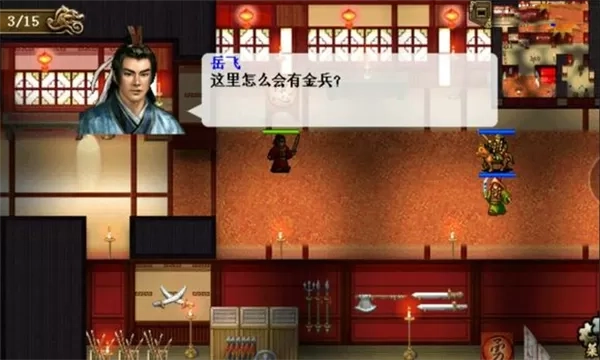本关开场前获取湛卢剑,此剑具备破甲攻击能力,能对敌人造成固定伤害,适合攻击力较弱的角色佩戴。全员协助岳飞冲入,触发剧情进行单挑。岳飞挑死柴桂后会面临选择,此时选择不鼓动造反。后续还有三种选择:其一,选择撤退至安全地点。过几回合牛皋会再次询问,若又选择撤退,牛皋便会打开中门,届时我军在中门防守即可,待消灭敌人接近尾声时,派人到下方城门引出贼兵,并用岳飞与其中一人对话。需注意,在岳飞尚未挑死小梁王(单挑2次)之前,两边的骑兵不可攻打,否则游戏结束。