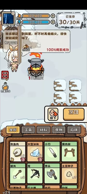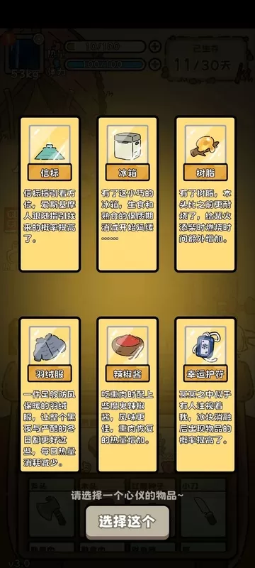 游戏分为两个阶段,前15天是准备阶段,在这段时间里,你可以进行打猎、伐木、赶海和捕鱼等活动,主要是为了储备食物和能够转化为食物的材料。接下来的15天则是冬季阶段,这个阶段的特点是食物短缺且消耗大,具体表现为两个方面:首先,每天所需的热量增加,前15天每天大约需要25点热量,而到了后15天,基础需求上升到40点,并且每隔几天还会逐渐增加,到最后几天时,热量需求会非常高,甚至在最后一天可能达到70点左右,很容易因为饥饿而在黎明前死亡。其次,由于天气原因,你无法再进行伐木、打猎、捕鱼或赶海等活动,取而代之的是每天可以获得四个冰块,融化这些冰块需要消耗一天的柴火,并且有三分之一的概率可以得到食物。此外,还会有爱斯基摩人来找你要打猎工具,你应该毫不犹豫地把这些工具给他们,因为他们之后很可能会在一两天内给你带来一些食物作为回报。不过,这两种方法所能提供的食物量都非常有限,因此在前15天尽可能多地储备食物是非常重要的。