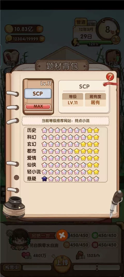 进入二级网站后,可挑选粉丝产出更为丰富的网站。在创作小说过程中,运用策略与粉丝互动,能够加快粉丝增长速度。写作能力中角色塑造的数值越高,每次更新所获得的粉丝数量也就越多。当一本书的阅读人数达到上限后,便不会再新增粉丝,因此一本书无需撰写过多章节,写到102章便可完结。