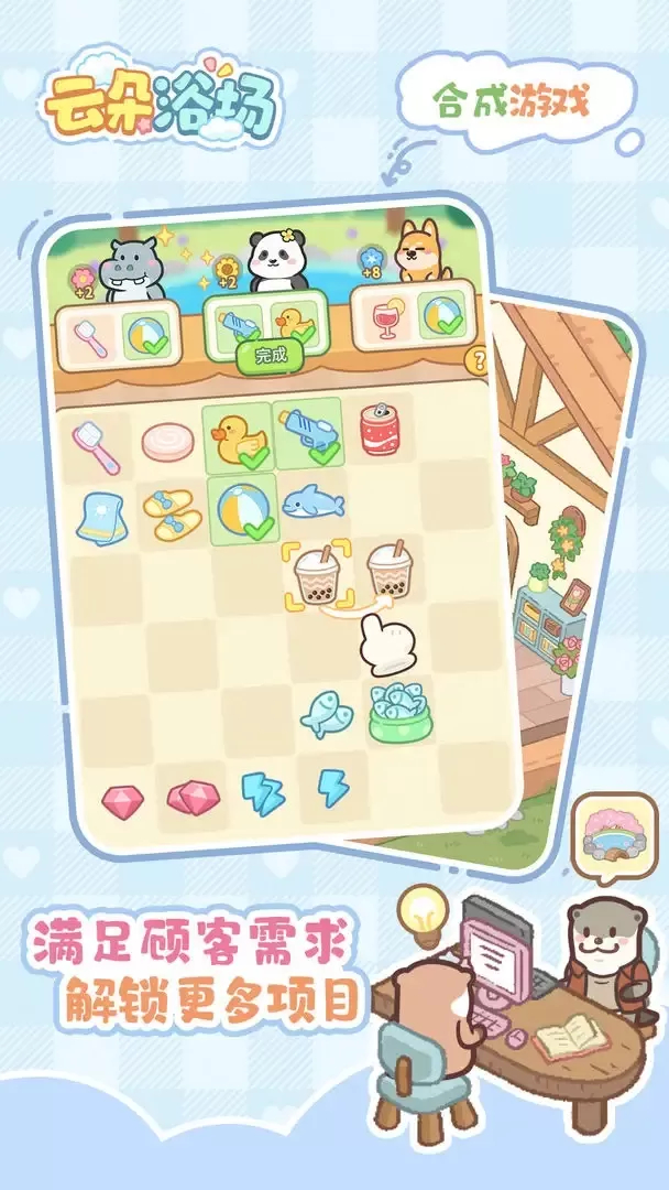 云朵浴场,一款画面超治愈的休闲经营养成游戏。踏入这个卡通梦幻天地,开启挑战之旅,解锁各类卡通装饰品,随心放置在浴场环境里,按个人喜好定制专属浴场。在忙碌生活中体验,畅享悠闲惬意的经营乐趣。合理搭配游戏中的浴场,管理经营轻松上手。提升顾客满意度,解锁更多设施,满足顾客洗浴需求。众多服务项目等你解锁,感兴趣的玩家千万别错过!