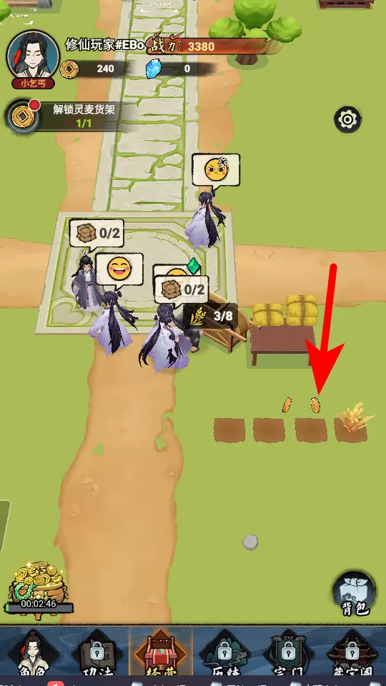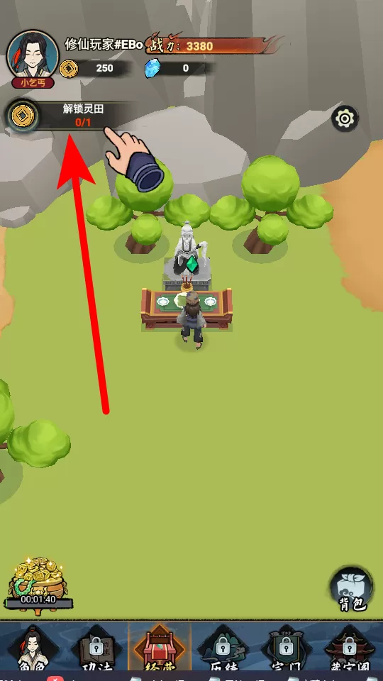 2、关注解锁灵田的任务进度,根据指引去完成解锁灵田的操作,灵田对资源获取有重要作用。