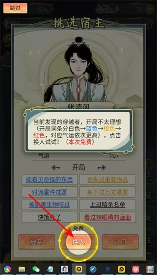 3、在挑选宿主界面,点击换人按钮,可更换宿主,宿主蓝色→橙色→红色代表气运优劣,选择气运高的宿主。