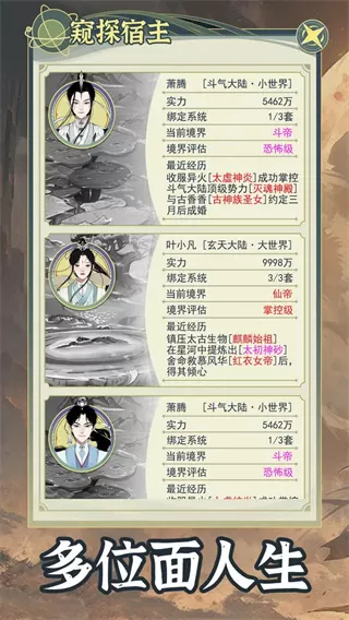 1、多元世界架构:构建六个特征鲜明的平行位面,涵盖东方武侠与现代都市等多种题材,每位宿主面临独特成长环境挑战。