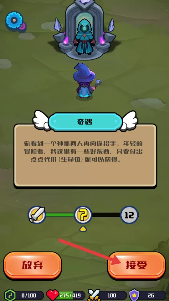 4、遇到神秘商人奇遇时,可点击【接受】,付出生命值代价获取好东西。