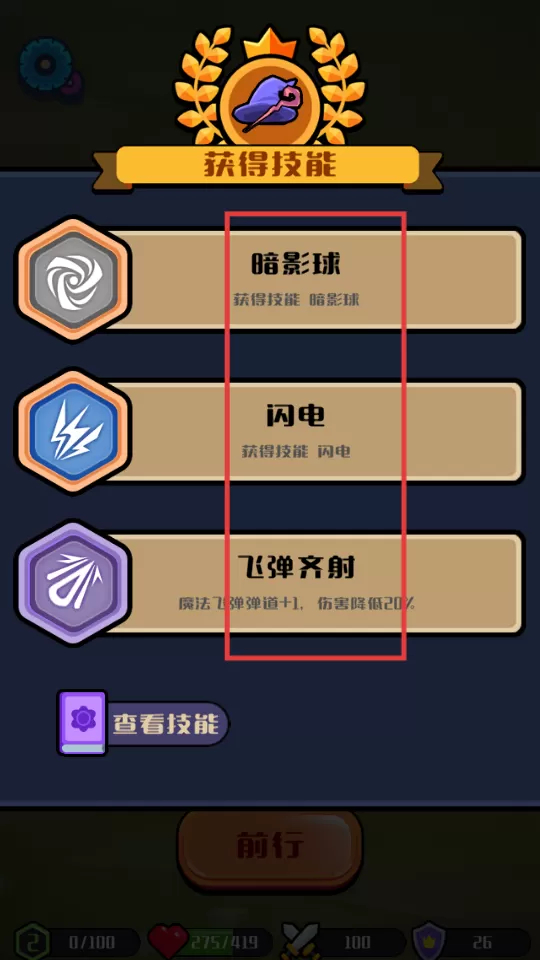 3、选择获得的技能,如暗影球、闪电、飞弹齐射,增强角色战力。