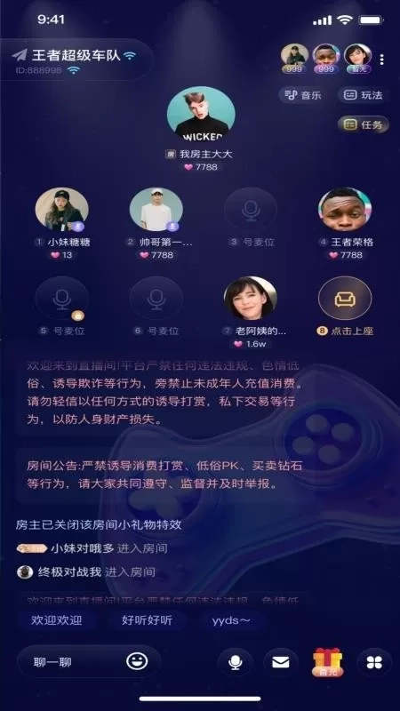 4、在语音房间内可使用文字聊天功能交流,或点击上麦按钮开启语音实时对话。