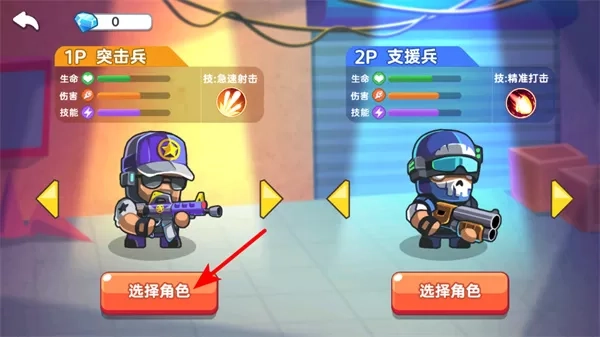 2、在角色选择界面,点击选择角色按键,挑选合适的角色,如突击兵,开启战斗征程。