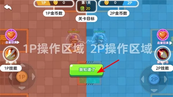 4、在战斗中,操控2P操作区域的摇杆,移动角色,与队友配合,共同击败敌人,完成目标。