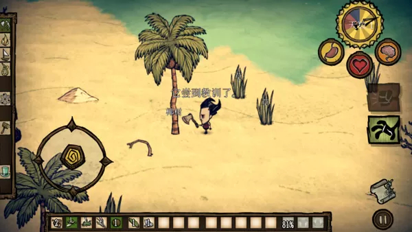 3、通过左侧轮盘能够操控角色移动,而生存天数、健康值以及饥饿值会在右上方显示。
