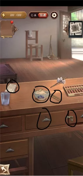2、点击桌面下方的锁,能获取抽屉上的锁以及中间抽屉里的一叠汇票。在桌面上,还能拿到借据、一双竹筷和一碗白饭。