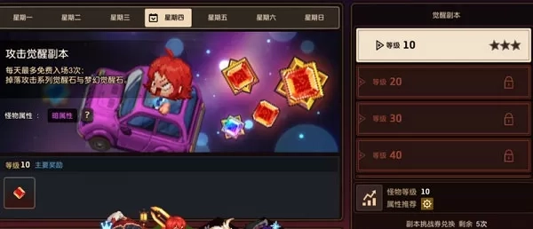 随着星期的不同,觉醒副本掉落的素材种类也就不同,不过因为没有体力消耗,再加上次数限制,每天固定刷满即可。至于挑战券兑换觉醒副本的次数……300钻3次,每天最多可以兑换5次,氪佬可以考虑,普通玩家按部就班即可。