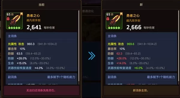 消耗词条洗炼对装备的词条数值、随机词条进行修改,上图中左侧是原属性,右侧是洗炼之后的数据,数值绿色即为增长,红色即为降低,可以据此来敲定结果的选择。