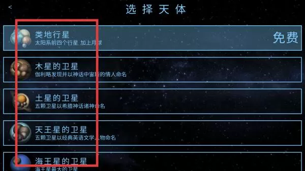 2、进入游戏主页面后,选择一个天体,比如类地行星,然后点击免费按钮,即可开始游戏。