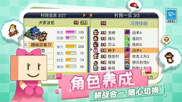 合战忍者村正版是一款具有模拟经营玩法的游戏。它延续了开罗游戏经典的像素风格画面,玩家在游戏里将着手经营管理一个忍者村庄。从招募自己心仪的忍者起步,同时还能够向到访的旅客售卖各类商品以获取收益。而赚得的钱财可充当军费,用于村民的修行,或者增强装备与兵力。