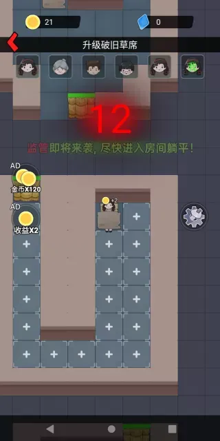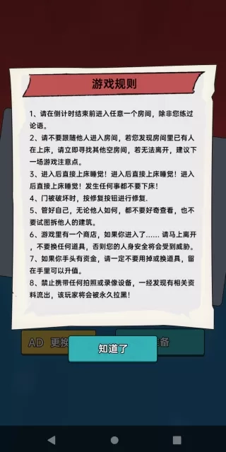 4. 玩家一进入地图,就得赶紧寻觅合适的房间,通过睡觉来发育并赚钱。要知道,一旦倒计时结束,梦魇便会前来攻击房门!快解锁各类武器展开防御吧!