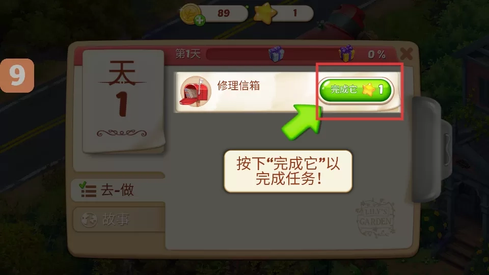 3、点击【完成它】按钮,完成修理信箱这一任务,从而获取相应奖励,推动游戏进一步发展。