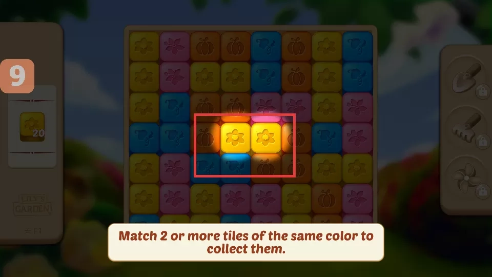 1. 找到并收集2个及以上颜色相同的方块,达成消除目标。