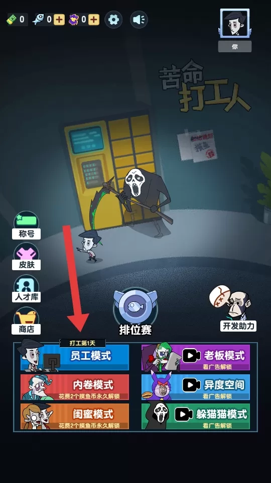1、在模式选择界面点击【员工模式】,进入游戏场景开启摸鱼挑战。