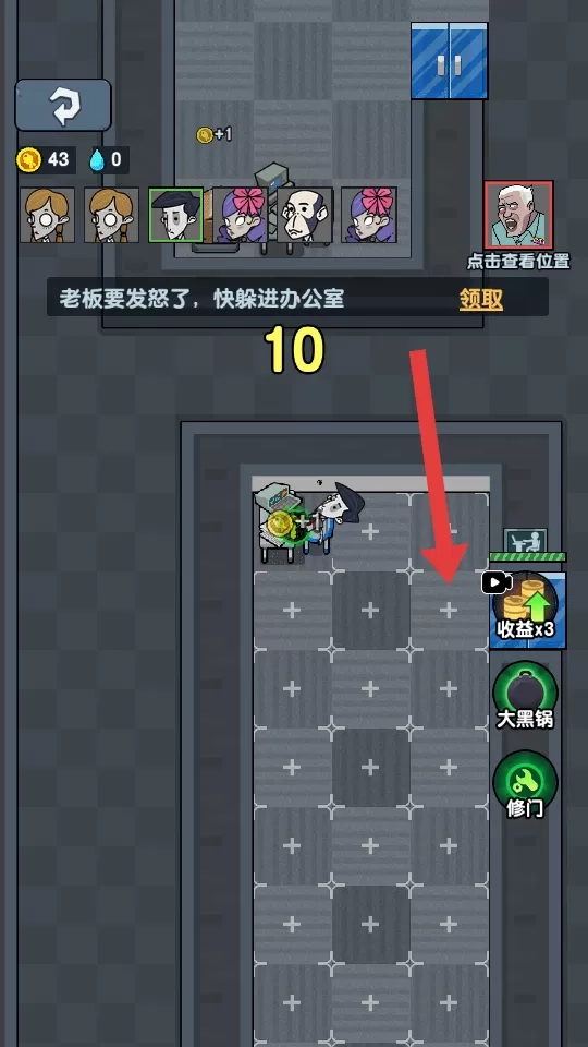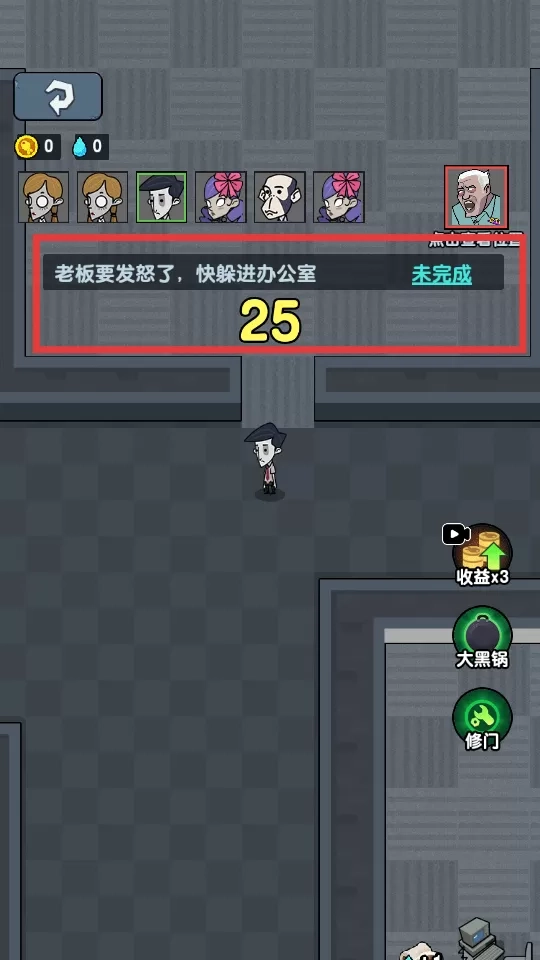 2、留意“老板要发怒了,快躲进办公室”这一提示,在倒计时归零前操控角色移动至办公室,以躲避老板的怒火。