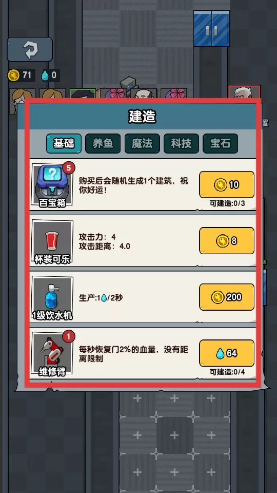 4、利用积累的金币和水滴,在建造界面选择建造建筑,增强办公室的防御和资源生产能力。