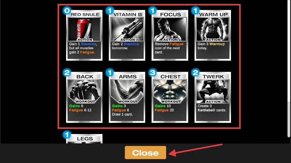 2、查看诸如【REDSNULE】【VITAMINB】这类卡牌的效果,点击【Close】,对健身卡牌的使用策略进行规划。