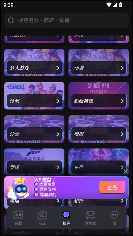 3、切换到搜寻界面,可查询各类游戏、直播内容及商店商品。
