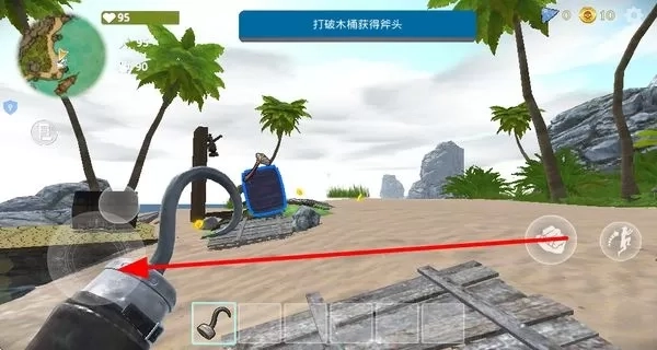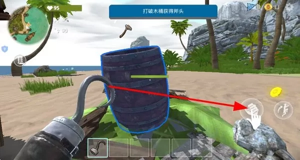 2、找到木桶并将其破坏,从中获取斧头工具,为后续砍伐树木、收集资源等操作做好准备。