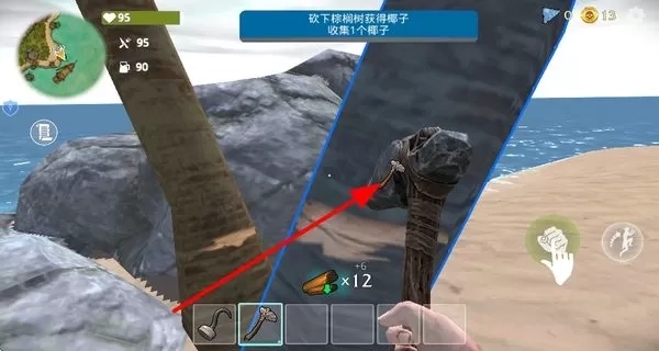 3、使用获取的斧头砍伐棕榈树,获取椰子等资源,这些资源可满足角色在荒岛上的生存需求。