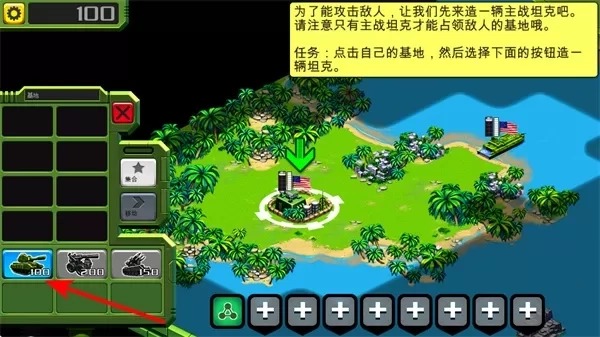 1、游戏初始阶段,点击自己的基地,选择坦克按钮制造坦克,是攻占敌人基地的核心单位,优先生产以开启进攻流程。