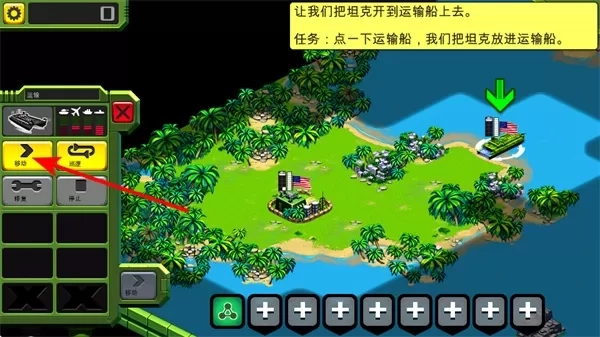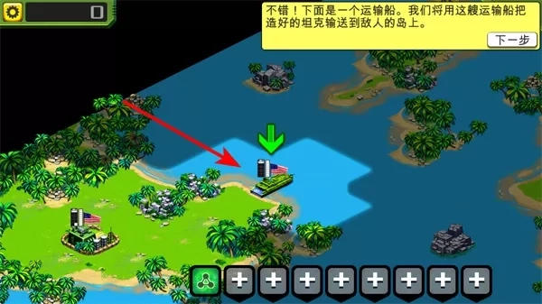 4、点击运输船,将坦克放入运输船中,完成坦克的运输部署,进而可向敌人岛屿发起进攻,占领基地以取得游戏胜利。
