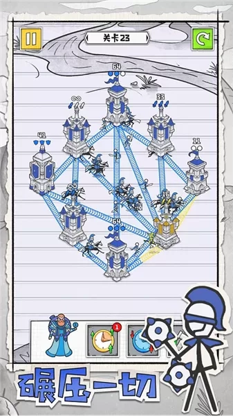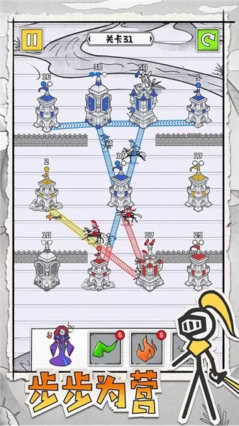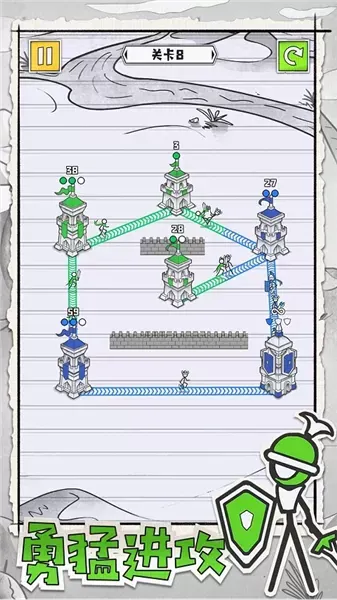 皇城攻防战是广州唯意科技有限公司精心打造的一款以火柴人为主题的休闲闯关策略塔防游戏。在这款游戏里,玩家操控火柴人展开塔防战斗,具体玩法是通过拖动城堡与其他城堡相连,从而实现城堡的占领,当成功占领全部城堡时,玩家即可宣告胜利。游戏精心设计了丰富多样的关卡,随着游戏进程推进,难度会逐步提升。不仅如此,游戏还为玩家准备了多个兵种,诸如步兵、骑兵、盾兵等不同种类的兵种等待玩家解锁。这些兵种各自具备独特的属性与技能,玩家需要根据实际情况,合理搭配兵种阵容。