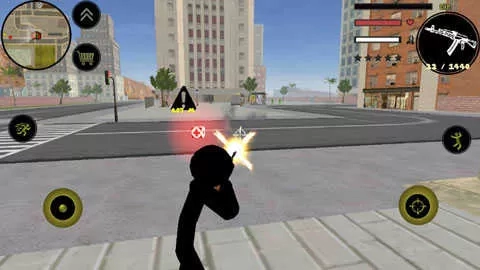左侧移动、加速,右侧绳索,攻击(跳跃),跳跃,右上侧的武器更换以及血量、经验的显示都实时更新,一览无遗,凭借着大家自由的玩法,与其他帮派的人物进行交火,期间杀人能够获得经验,杀多了会产生星级,警察和其他附近角色会特殊照顾你对你展开火热的进攻,而如何存活,如何将其他人物击杀则是你所需要完成的任务。