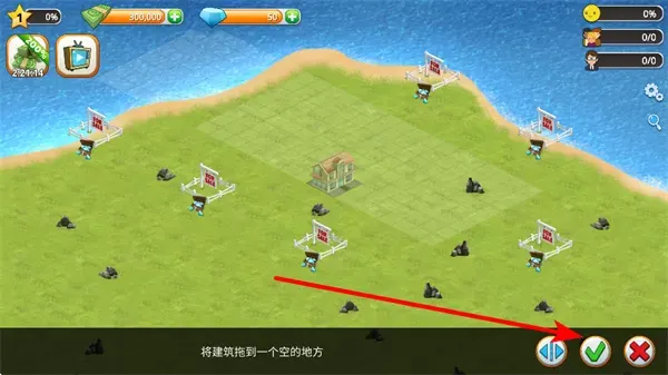 3、将选择的建筑拖到空地上,点击绿色对勾按钮确认建筑放置,完成建筑的建设部署,逐步完善城市的建筑布局。