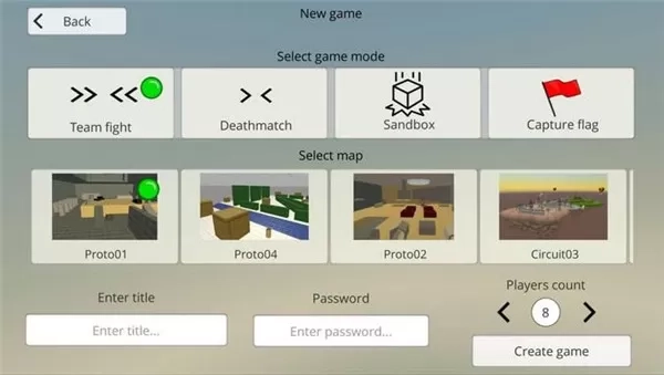2、当然,房间也能够自行创建。有「组队战」、「死亡模式」、「沙盒模式」、「夺旗战」这四种模式可供选择。