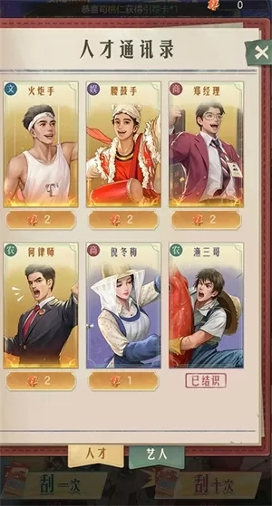 3、游戏开局时,刮刮乐会赠送一张人才引荐卡,这张卡十分关键。建议您先留存两张,再进行兑换,因为前期用单张兑换紫色奖励,性价比非常低。第二张人才引荐卡获取途径有两种,一是抽取,二是通过引荐卡碎片合成。首次兑换强烈推荐选择“郑经理”,兑换后能增加两次广场斗鸡活动的参与次数,性价比极高。