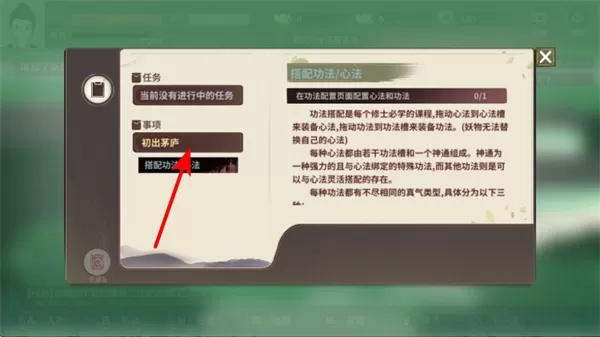 1. 在游戏事项界面中,点击“搭配功法”选项,以此了解功法与心法的搭配规则,这些规则是提升角色战力的重要知识储备。