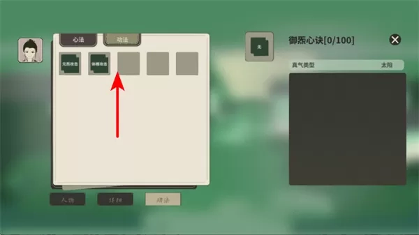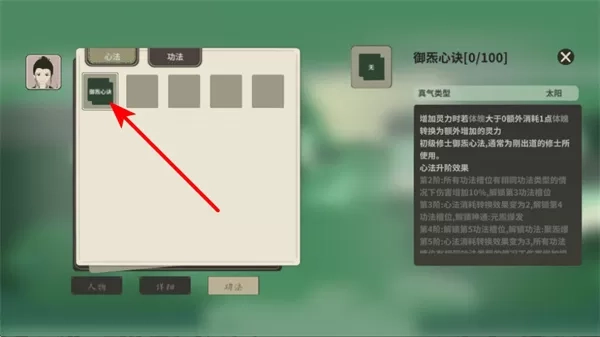2、在心境界面,选择御燕心诀等心法,心法是修炼体系的核心部分,选择合适的心法可增强角色的真气。