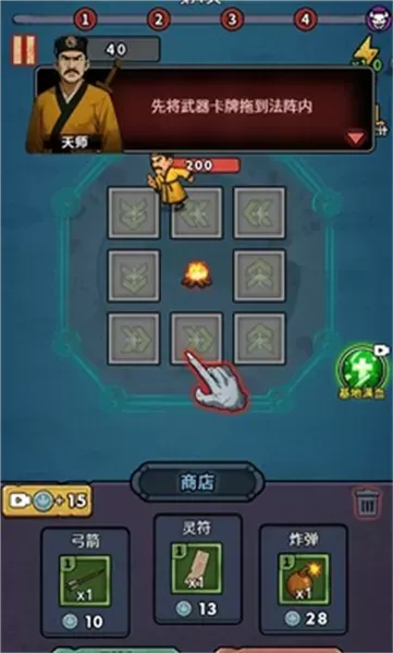 1、通过拖拽道士角色至八卦阵眼部署防御单位,长按角色可激活二段技能。